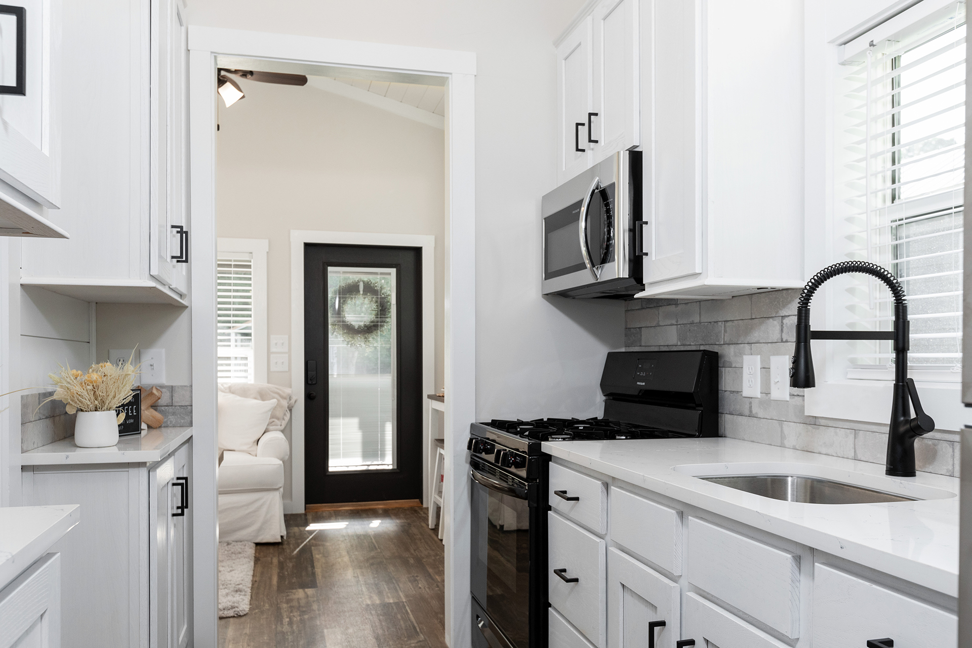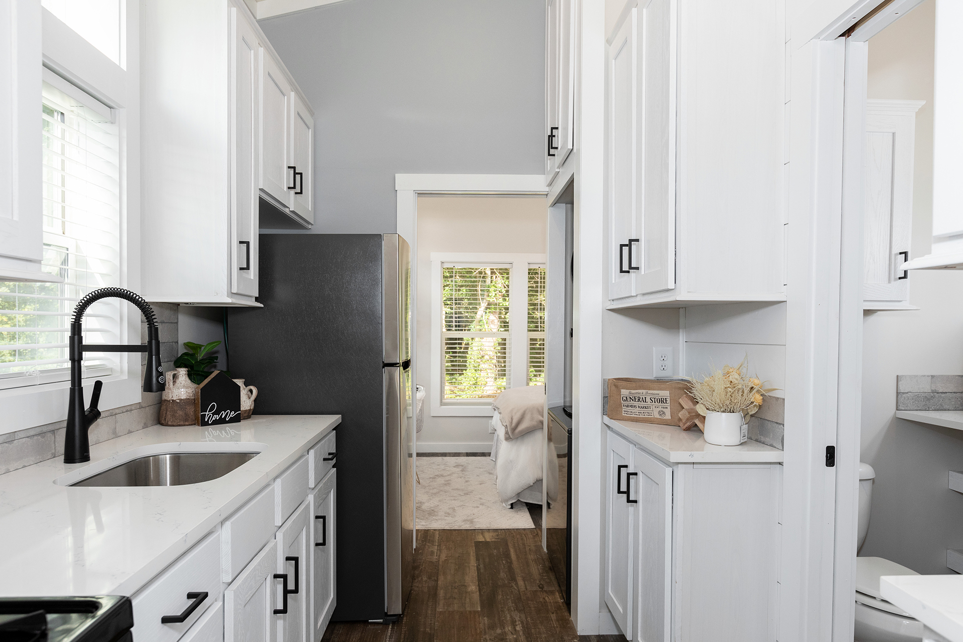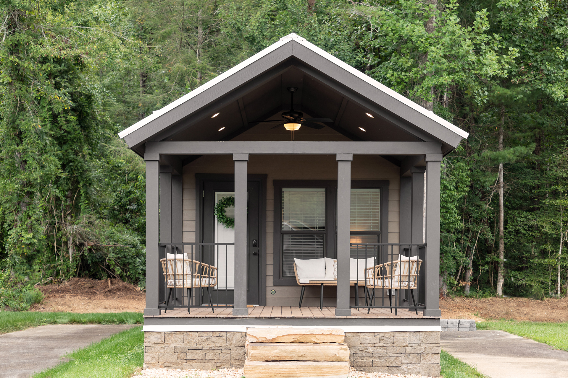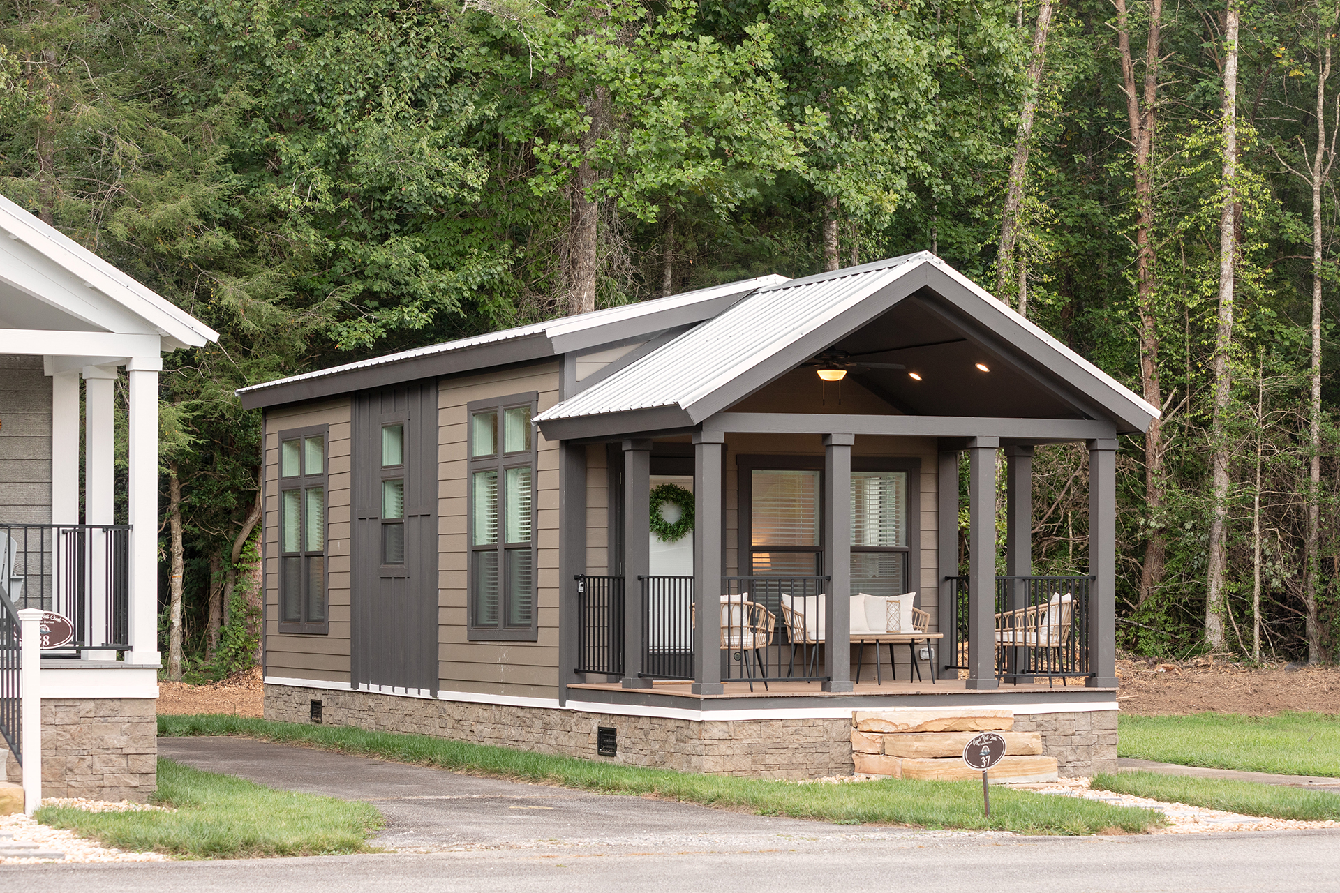The bright and airy Cahaba Park Model is a stylish hideaway perfect for any modern family of four. The exposed beams, quartz countertops and king-sized master suite shine in the abundance of natural light. While this model’s front porch invites more sunshine, the rear porch has been screened in to create a more private setting.