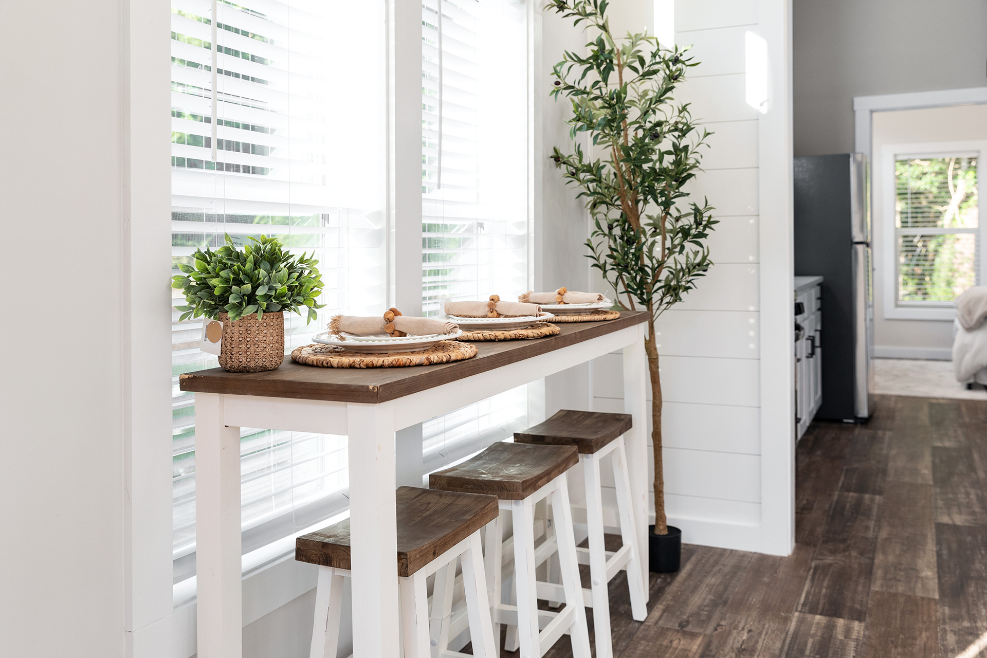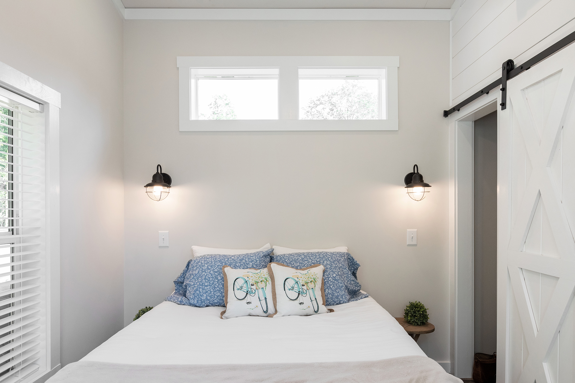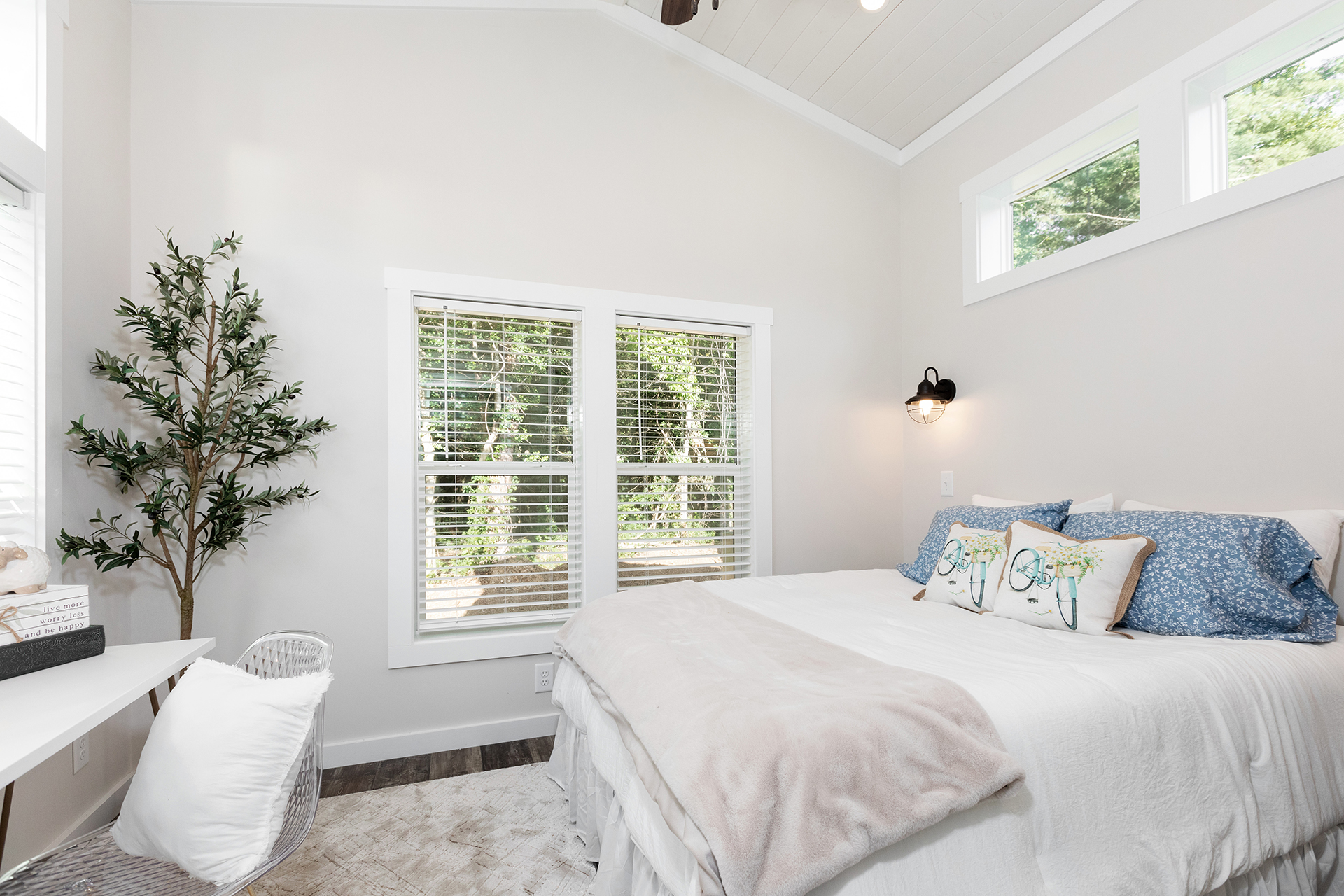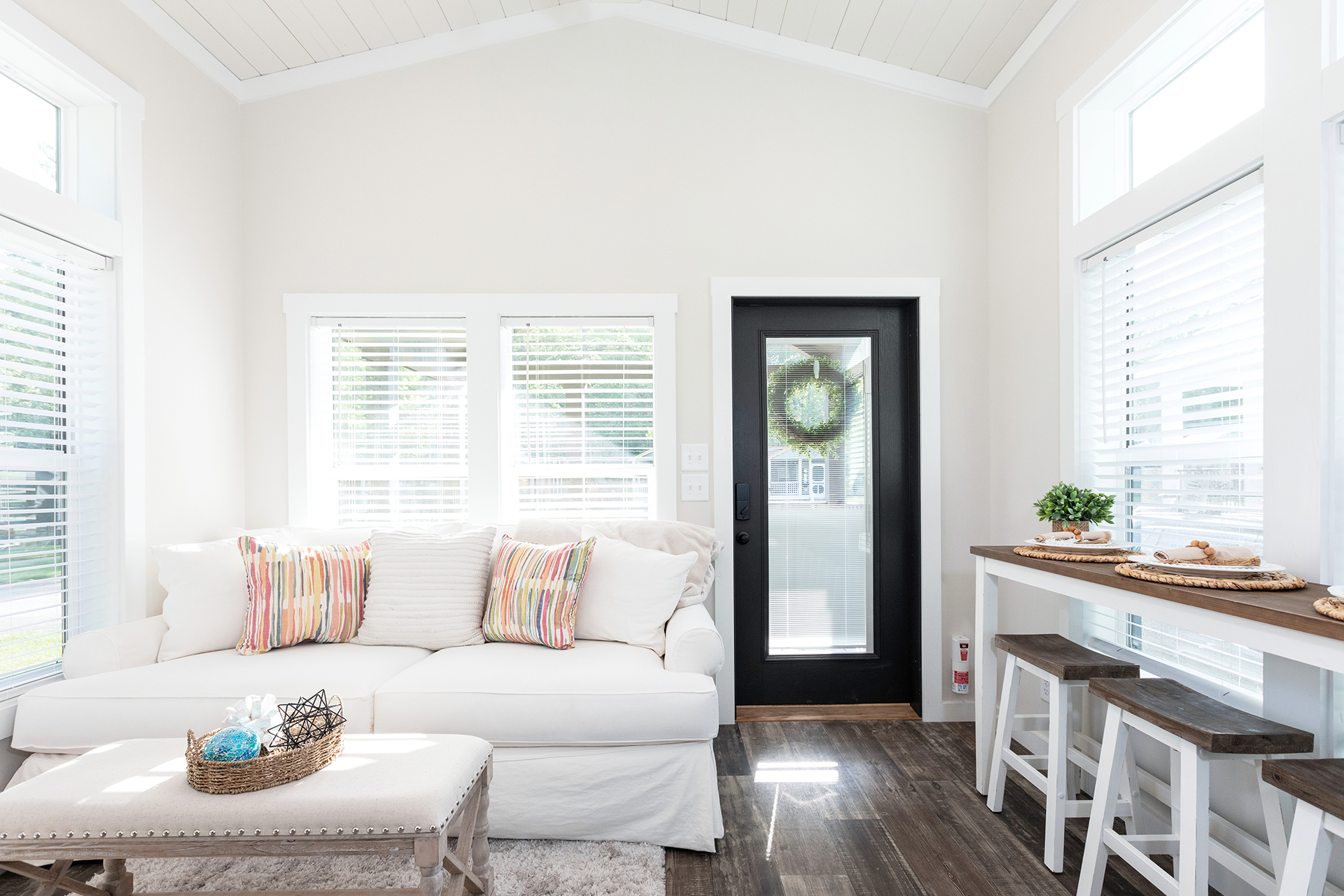 The bright and airy Cahaba Park Model is a stylish hideaway perfect for any modern family of four. The exposed beams, quartz countertops and king-sized master suite shine in the abundance of natural light. While this model’s front porch invites more sunshine, the rear porch has been screened in to create a more private setting.